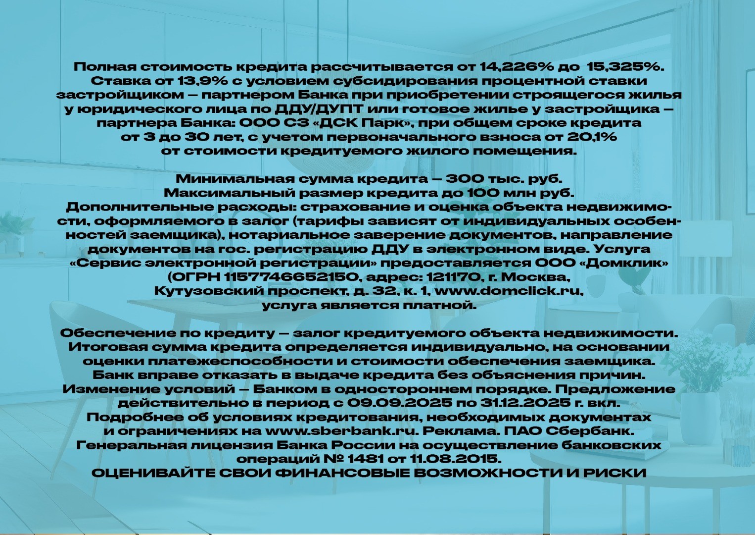 Полная стоимость кредита рассчитывается от 14,226% до 15,325%. Ставка от 13,9% с условием субсидирования процентной ставки застройщиком – партнером Банка при приобретении строящегося жилья у юридического лица по ДДУ/ДУПТ или готовое жилье у застройщика – партнера Банка: ООО СЗ «ДСК Парк» (проектное финансирование Банк Дом РФ), при общем сроке кредита от 3 до 30 лет, с учетом первоначального взноса от 20,1% от стоимости кредитуемого жилого помещения. Минимальная сумма кредита – 300 тыс. руб. Максимальный размер кредита до 100 млн руб. Дополнительные расходы: страхование и оценка объекта недвижимости, оформляемого в залог (тарифы зависят от индивидуальных особенностей заемщика), нотариальное заверение документов, направление документов на гос. регистрацию ДДУ в электронном виде. Услуга «Сервис электронной регистрации» предоставляется ООО «Домклик» (ОГРН 1157746652150, адрес: 121170, г. Москва, Кутузовский проспект, д. 32, к. 1, www.domclick.ru, услуга является платной. Обеспечение по кредиту – залог кредитуемого объекта недвижимости. Итоговая сумма кредита определяется индивидуально, на основании оценки платежеспособности и стоимости обеспечения заемщика. Банк вправе отказать в выдаче кредита без объяснения причин. Изменение условий – Банком в одностороннем порядке. Предложение действительно в период с 09.09.2025 по 31.12.2025 г. вкл. Подробнее об условиях кредитования, необходимых документах и ограничениях на www.sberbank.ru. Реклама. ПАО Сбербанк. Генеральная лицензия Банка России на осуществление банковских операций № 1481 от 11.08.2015.
