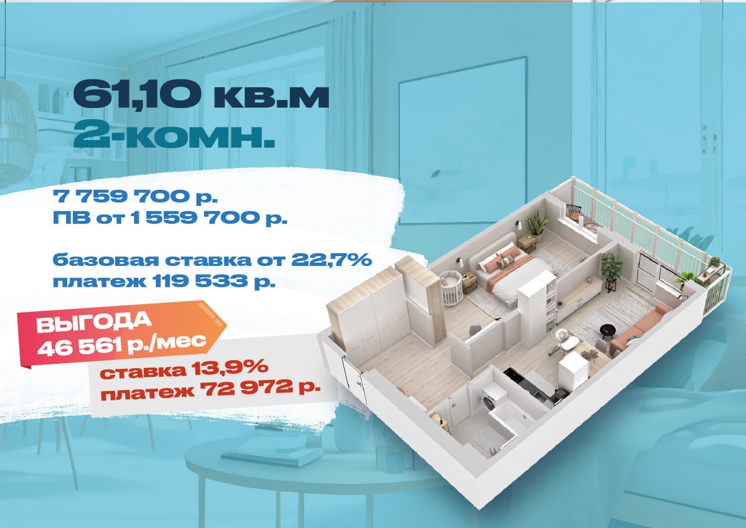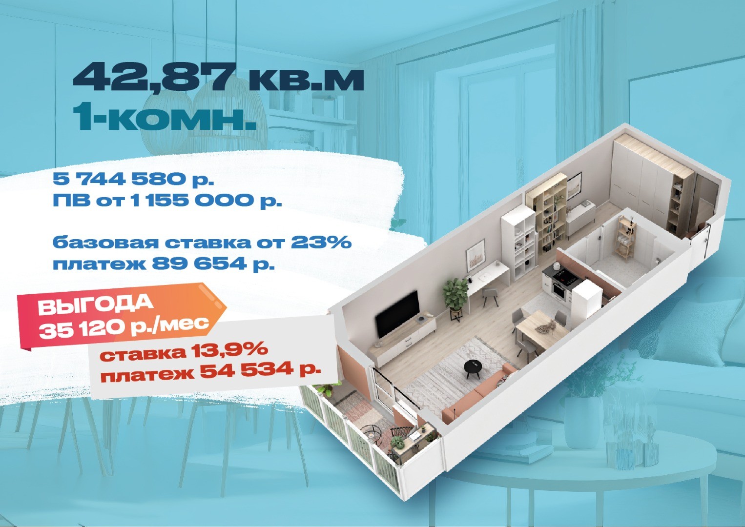 Выгода более 35 тыс. руб. на ежемесячных выплатах при покупке однокомнатной квартиры.